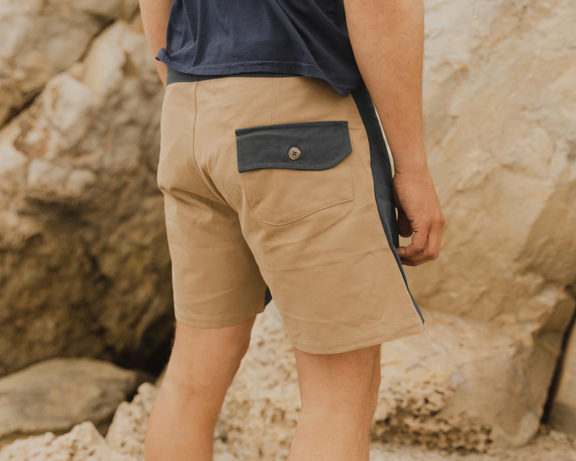 Gato Heroi Surf Shorts are 100% Cotton and made in Europe. They have a drawstring at the front, and a pocket at the back right side with flap and button closure. The Two Tone Surf trunks have a fitted waistline and are an above the knee fit. Machine wash cold/Dry flat.